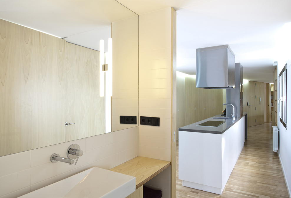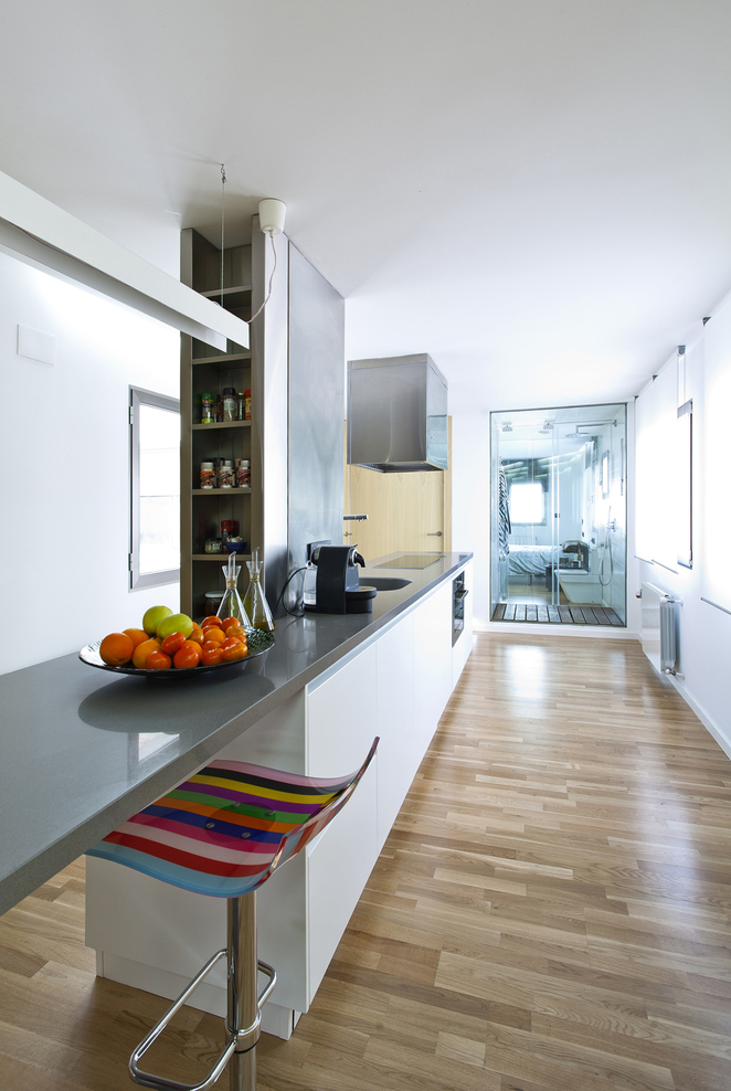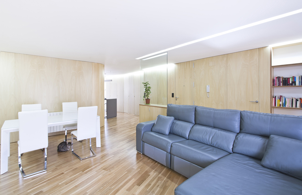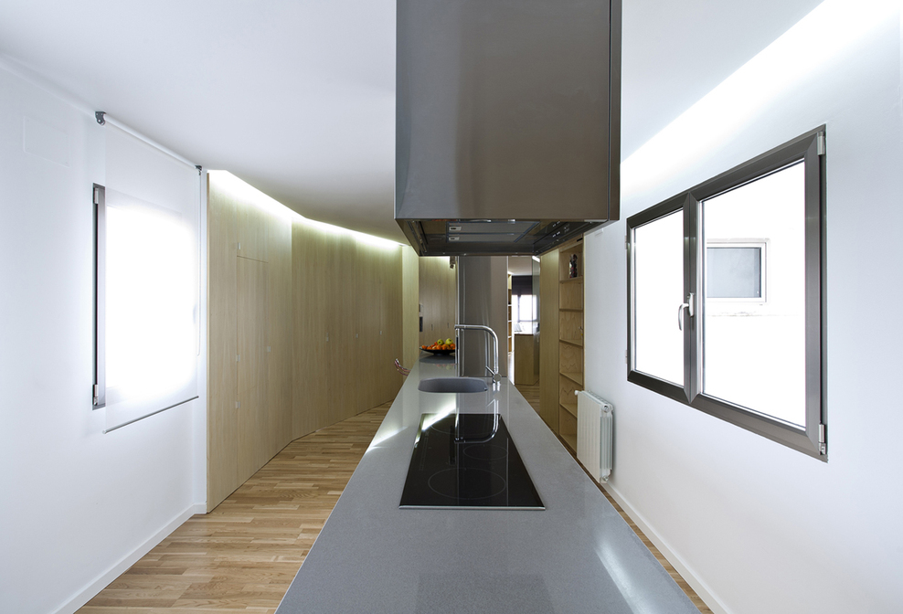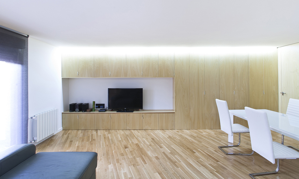 Les très nombreux rangements se font oublier derrière les parois de bois. Les portes se font tout aussi discrètes dans ces murs.
